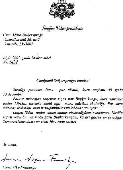 the current president of Latvia. The letter below from the president, addressed